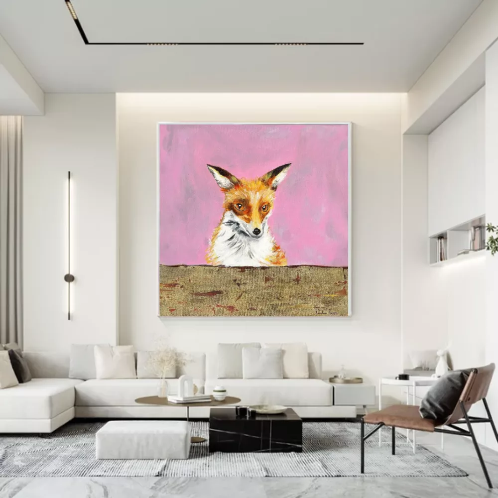 This fox wall art transforms interiors instantly. Hang it where natural light meets soft textures—linen curtains, wood tones, stone or muted grey walls. The pink background introduces subtle warmth, while the fox’s golden highlights mirror sunlight beautifully. In open-plan living rooms, pair it with complementary artwork such as the Irish Hare Painting or Fiery Red Head Rooster Painting to create cohesive wildlife art Ireland gallery walls.