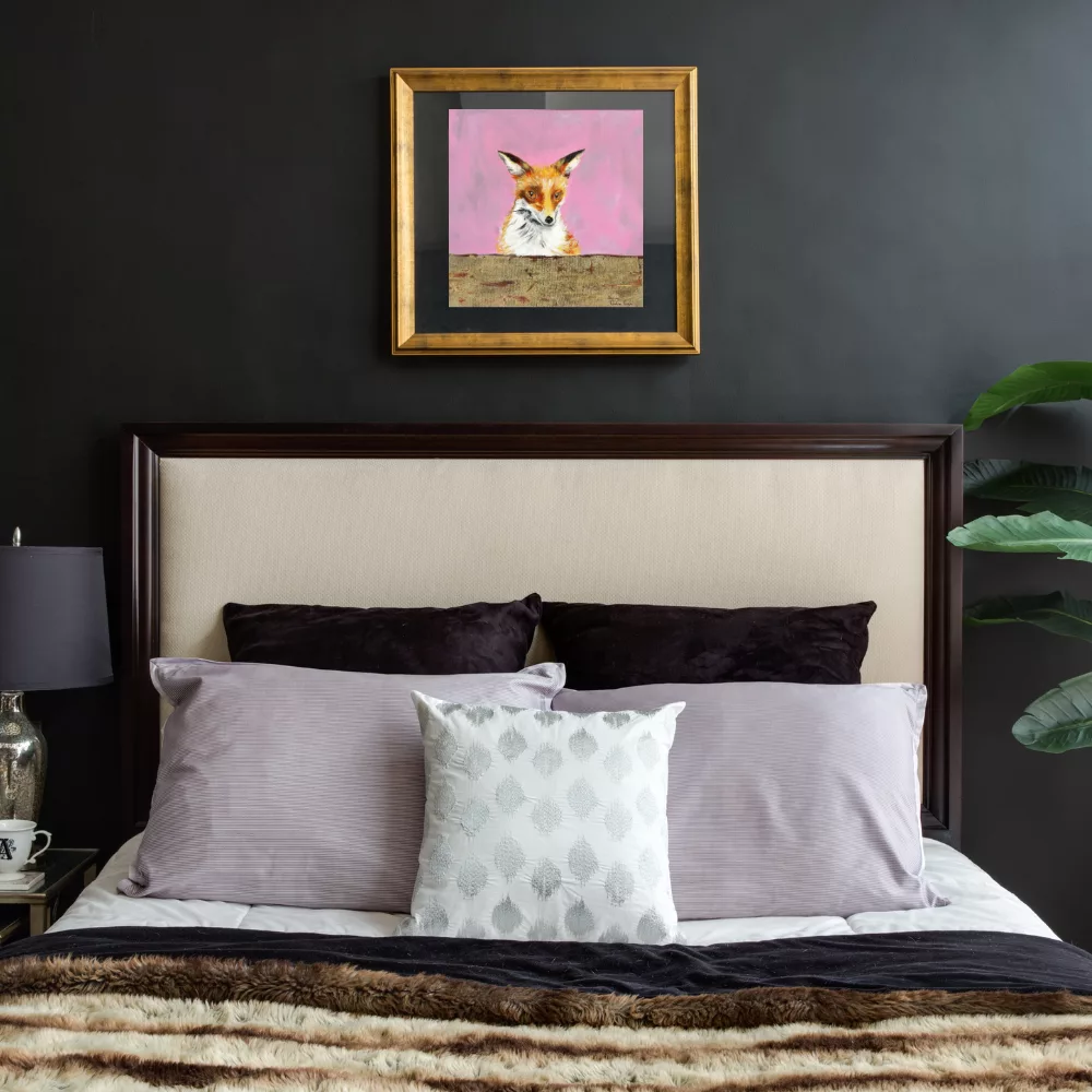This wildlife art Ireland piece balances traditional subject matter with a playful, modern colour palette. The pink backdrop turns rustic into refined, transforming the familiar into something new. It’s abstract fox painting with a contemporary twist—structured, yet spontaneous; vibrant, yet calming. The subtle metallic warmth makes the fox almost breathe.