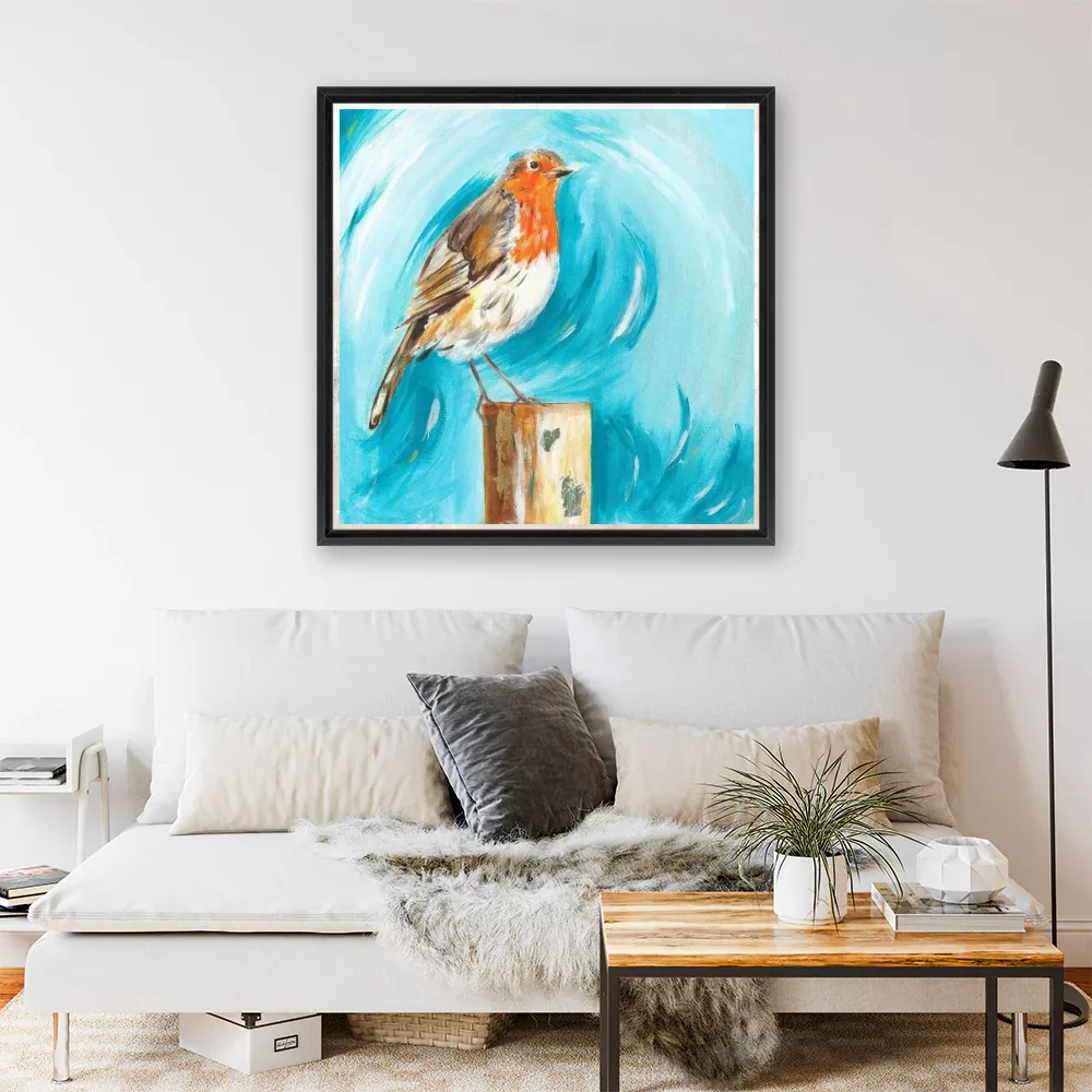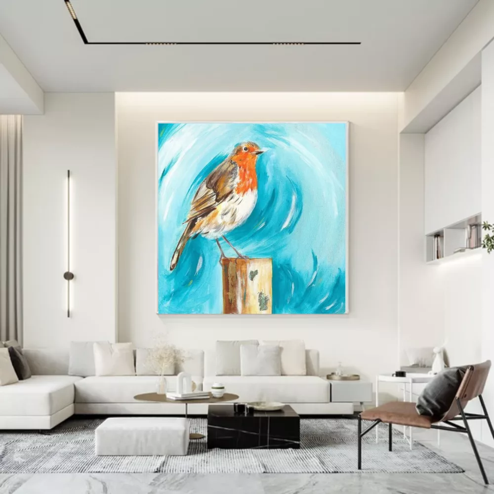 Caroline’s expressive technique blends precision with spontaneity—layering blues, whites, and hints of warm coral to create movement within stillness. This painted robin feels alive yet tranquil. The soft blue ground (that unmistakable robins-egg hue) enhances the orange breast, creating a gentle visual balance. It’s both contemporary and timeless—an acrylic robin painting that fits beautifully into any home, gallery, or quiet corner.