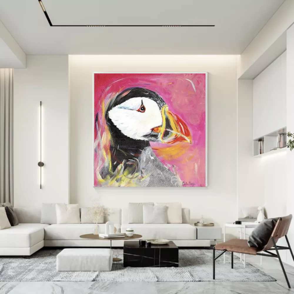 A: Its joyful pink backdrop, expressive brushwork, and lively colour palette capture the puffin’s playful character — a true wildlife art Ireland gem.