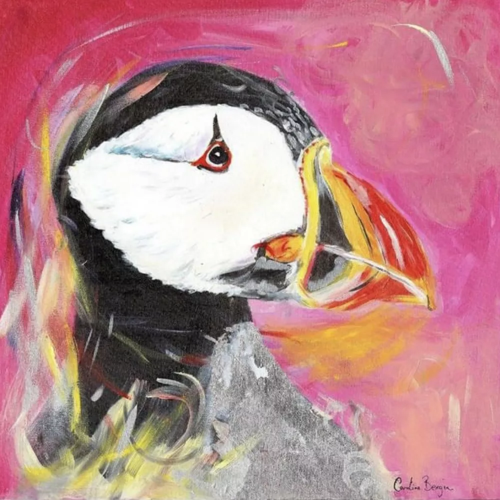 In this puffin painting, titled Precious the Puffin, Caroline has evoked a deep sense of joy and energy, capturing the vibrant personality of Ireland’s beloved seabird. The use of bold colours and expressive brushwork creates a dynamic and engaging piece of art. Puffins are well known for their colourful beaks, and Caroline has portrayed this distinctive feature with bold strokes and confident composition.